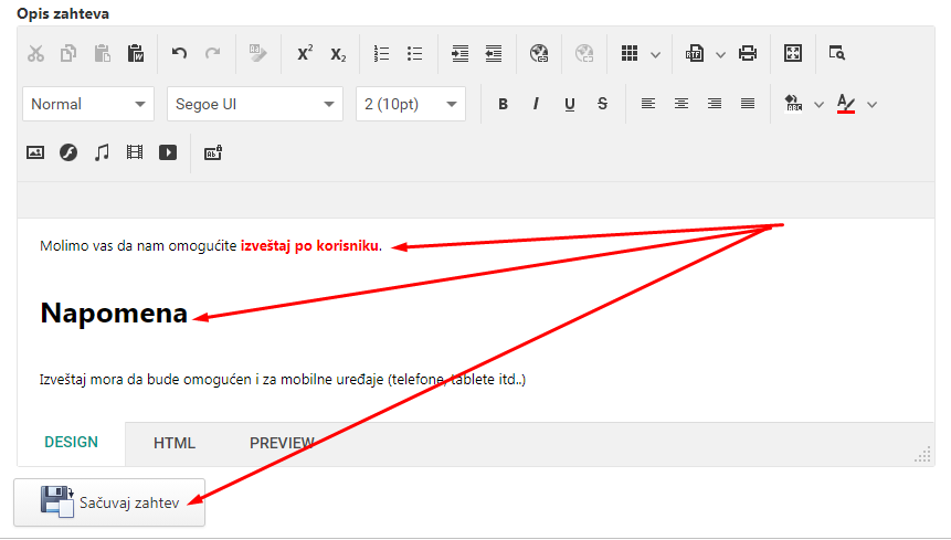 U polje [OPIS ZAHTEVA] upišite temeljito vaš zahtev sa svim pojedinostima. Možete koristiti formatiranje teksta kao u Wordu.