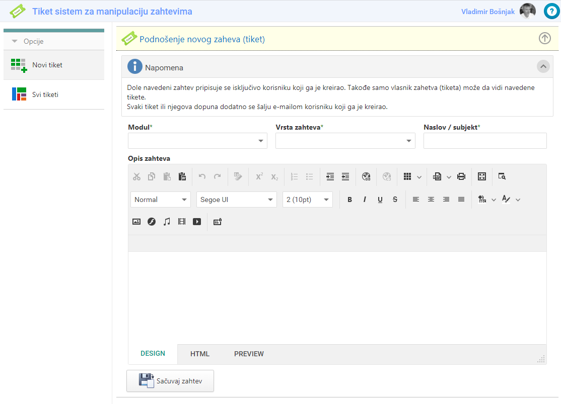 U oba slučaja dobijete formu "Tiket sistem za manipulaciju zahtevima" kao na slici dole.