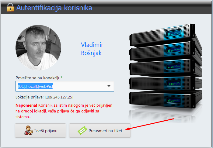 Dovoljno je da bude otvoren kao korisnik u sistemu sa svojom e-mail adresom i da se prijavi na sistem. Kada se pojavi forma za izbor konekcije jednostavno se klikne na dugme [Preusmeri na tiket]