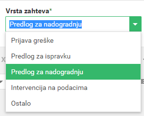 Iz polja [VRSTA ZAHTEVA] odaberite na koju vrstu se odnosi vaš zahtev.