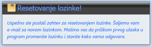 Kada vam sistem uspešno pošalje e-mail sa novom lozinkom na ekranu dobijete poruku koja to potvrđuje.